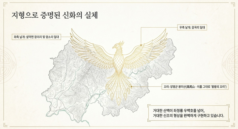 봉황의 전설이 전해져오는 지역이나 산에서는 봉황을 닮은 지형을 발견할 수 있고, 오동나무와 대나무 등으로 봉황이 찾아오도록 유도한 지명(地名)이 발견된다.