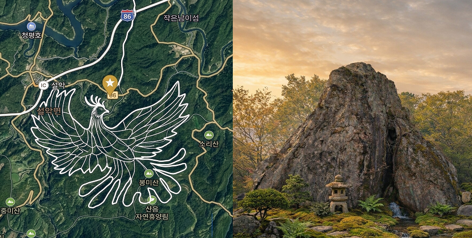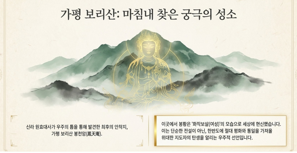이 봉황은 우주의 열린 틈을 타 일찌감치 한반도에 내려온 뒤 지리산 천은사, 강원도 고성 건봉산 등지로 옮겨다니다가 최종으로 가평 보리산 봉천암(鳳天岩)에 안착했다. 이곳이 태평성세의 시기가 왔음을 알리는 곳이기 때문이다.
