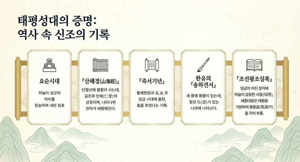 -전국시대 역사서 『죽서기년』에는 다음과 같이 기록하고 있다. “봉황이 황제헌원과 요(堯)ㆍ순(舜)ㆍ주(周) 임금 때 출현하여 춤을 추었다.”