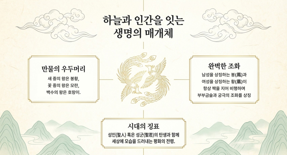 -봉황은 평화로운 세상을 상징하는 존재로서, 성인(聖人) 혹은 성군(聖君)의 탄생과 함께 세상에 그 모습을 드러내는 새로 알려져 있다. 따라서 예로부터 봉황이 출현할 경우 어떤 이가 권력을 행사하든 그의 통치 시대는 평화로운 세상이 된다는 믿음이 전승돼 왔다.